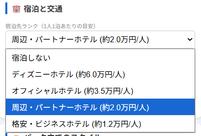 - 自家用車: 「出発地に応じた高速代・ガソリン代の目安」+「パークの駐車場代(日数分)」を算出。1台あたりの固定費として計算するため、人数を増やしても交通費は変動しません。