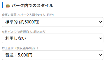 - 食事代: パークに入園する日の分だけ、選択したランクの食事代を加算します。